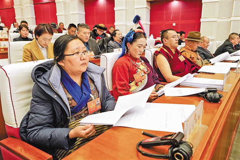圖為政協(xié)委員們認(rèn)真聆聽政協(xié)常委會(huì)工作報(bào)告。記者 丹增群培 攝
