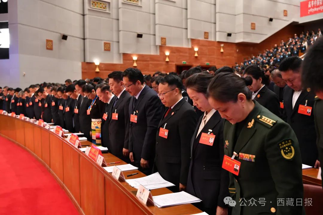 隨后,洛桑江村宣布:西藏自治區第十二屆人民代表大會第三次會議開幕。會場全體起立,高唱國歌。