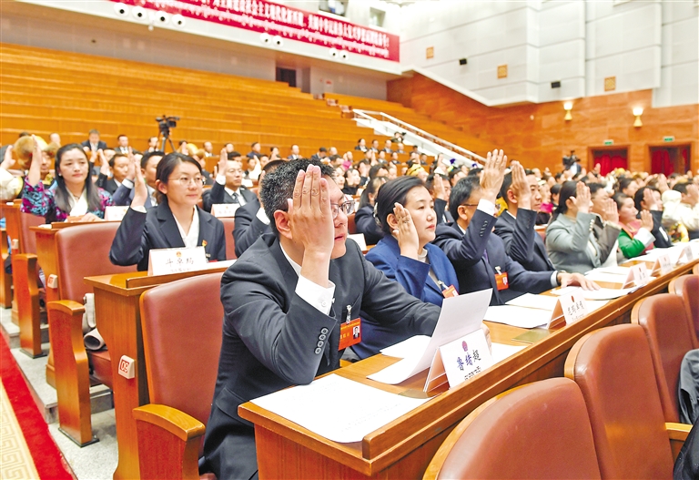 閉幕會現(xiàn)場,氣氛莊重?zé)崃摇R淮未伪頉Q,一陣陣掌聲,凝聚著人大代表們的集體智慧,傳遞著全區(qū)人民的共同愿望。