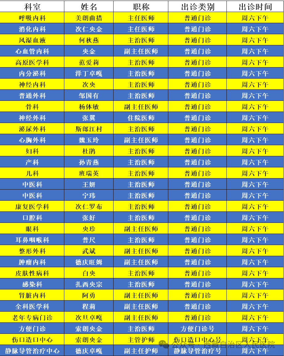為切實滿足患者多元化的就醫需求,改善患者就醫體驗,提升醫療服務的可及性與便利性,自2025年4月12日(星期六)起,西藏自治區人民醫院再次對周六門診進行了全面升級,周六全天候為患者提供與工作日相同的“無差別”服務,并且為保證患者診療的連續性,相關醫技科室也將同步運行。