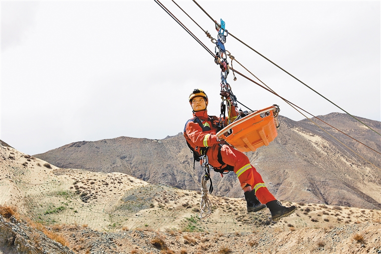 消防員進行T型橫渡救援科目演練。通訊員 孫成仲 攝