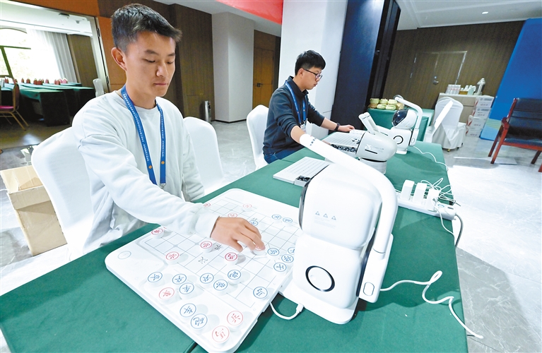 圖為“拉薩職工互助保障杯”智力運動會現(xiàn)場,象棋選手在賽前與智能機器人對弈。