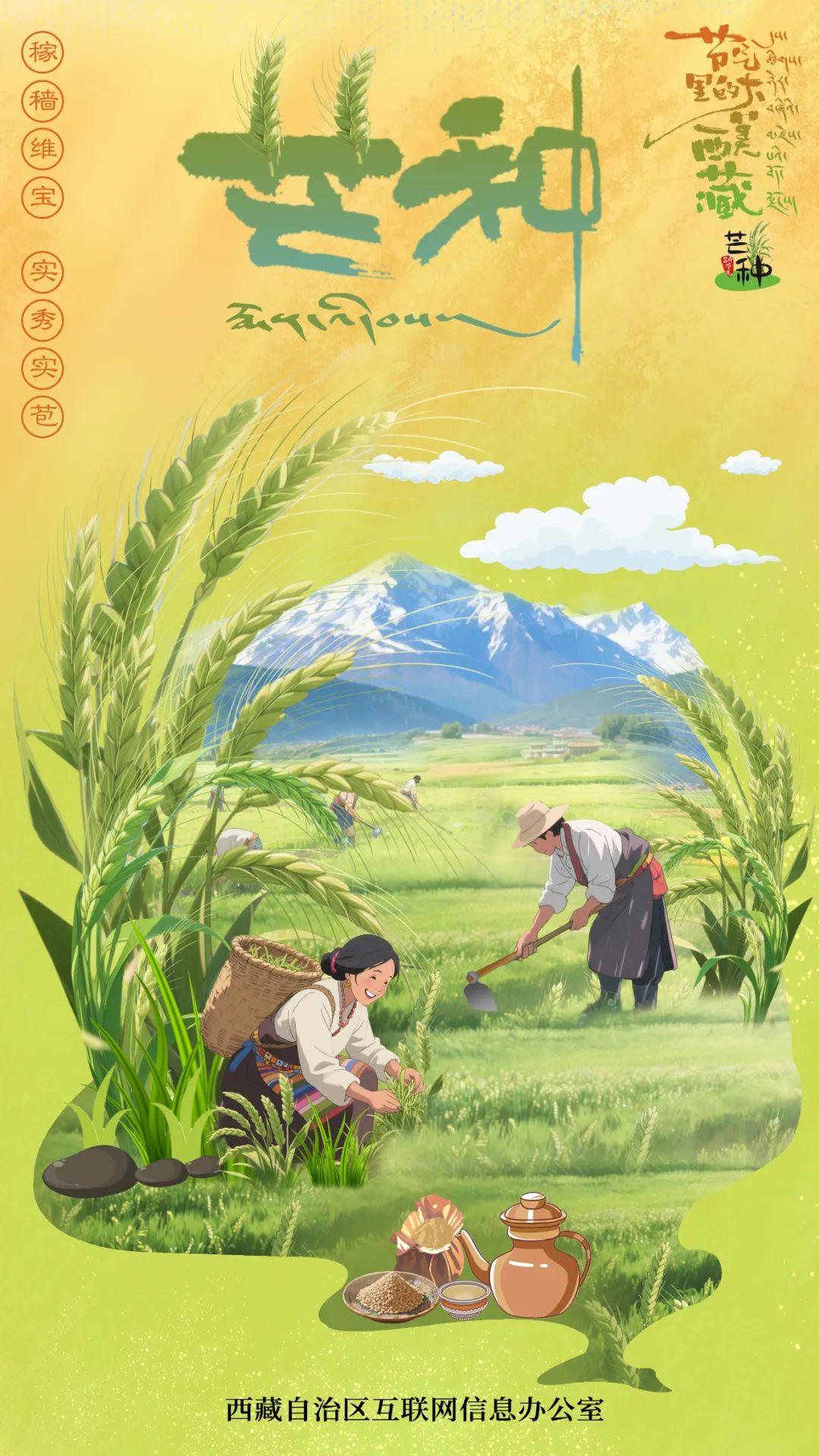 節序屆芒種,何人得幽閑。芒種時節,西藏光照足、多夜雨,青稞幼苗在雪山、藍天、白云下迅速生長、生機勃勃,人們在青稞地里辛勤勞作,灌水、鋤草……