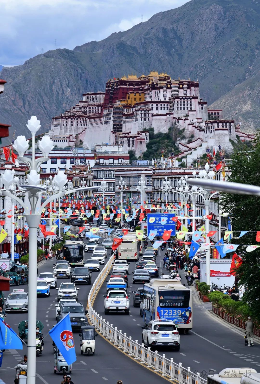 圖為彩旗飄揚、裝飾一新的拉薩市北京中路。記者 唐斌 洛桑 攝