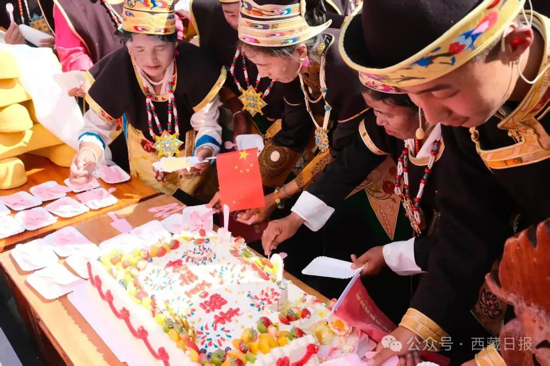 圖為林芝市巴宜區林芝鎮嘎拉村群眾歡聚一堂,分享寫有“幸福嘎拉村”的蛋糕。記者 王珊 謝筱純 攝