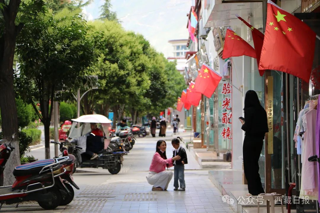 圖為山南市主城區沿街商鋪懸掛起鮮艷的五星紅旗慶祝西藏自治區成立60周年。記者 武沛濤 通訊員 擁青卓嘎 攝