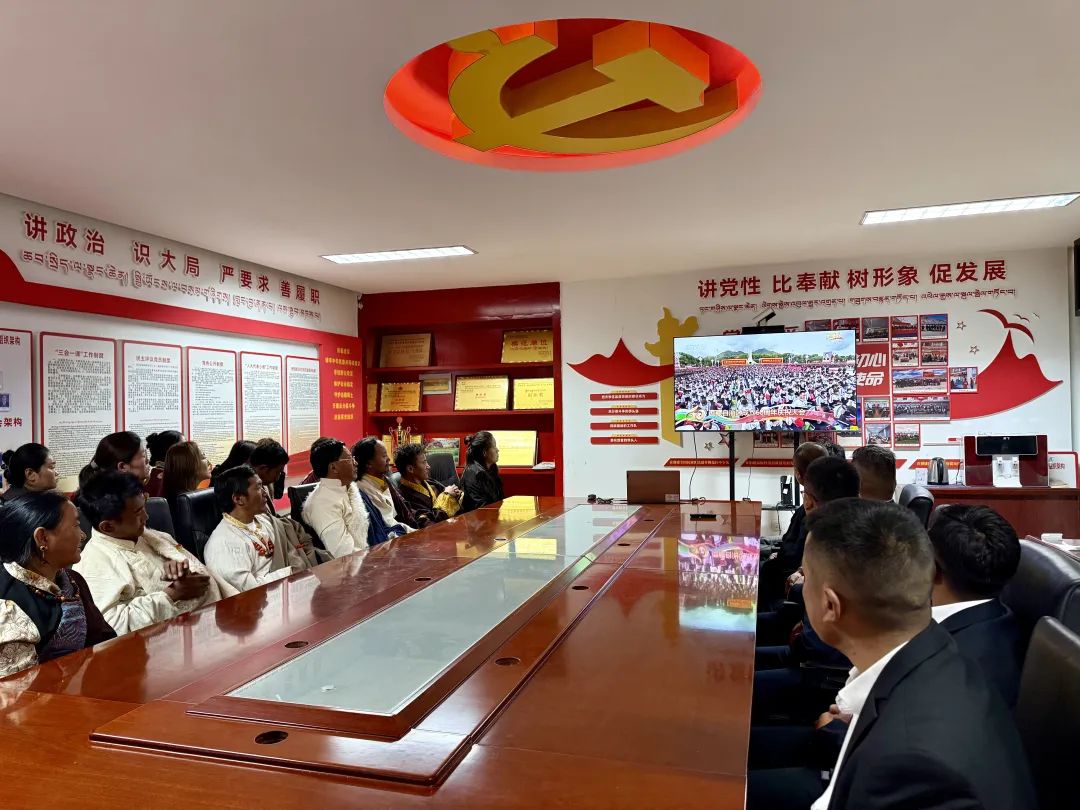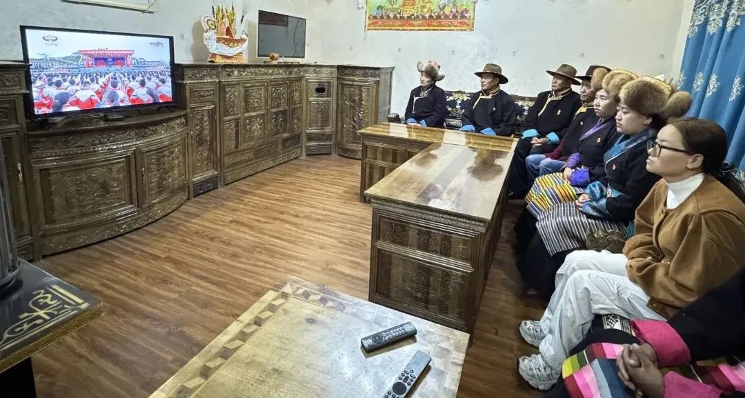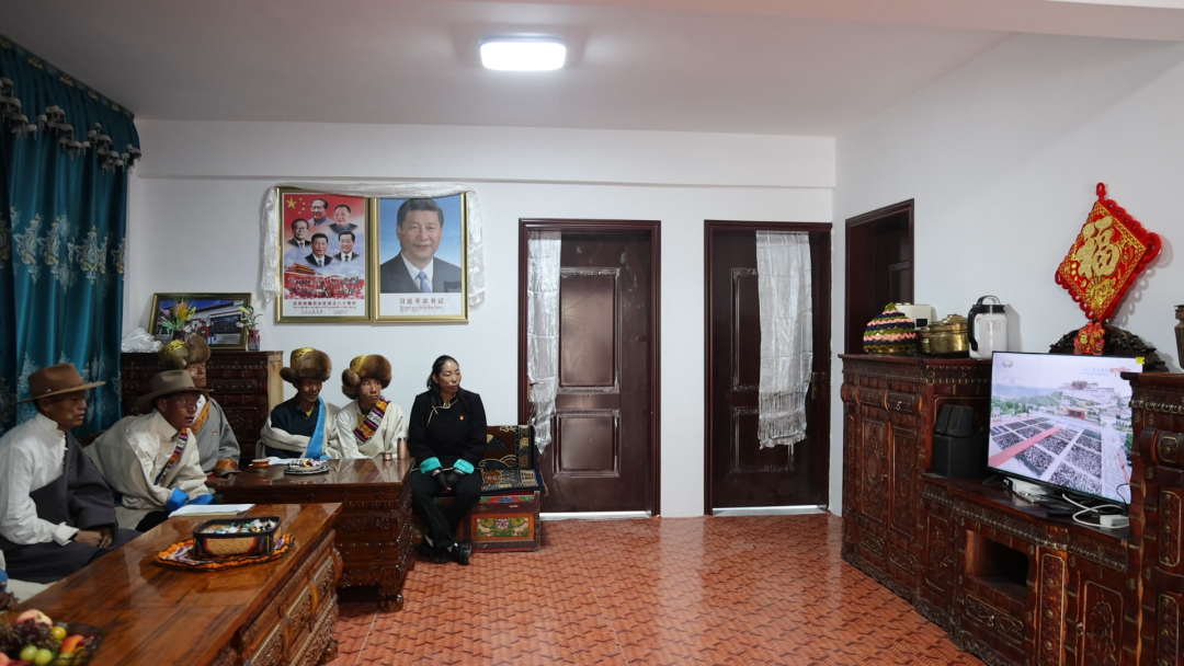 圖為山南市乃東區昌珠鎮克松村“兩委”班子收聽收看西藏自治區成立60周年慶祝大會盛況。記者 巴桑旺姆 攝
