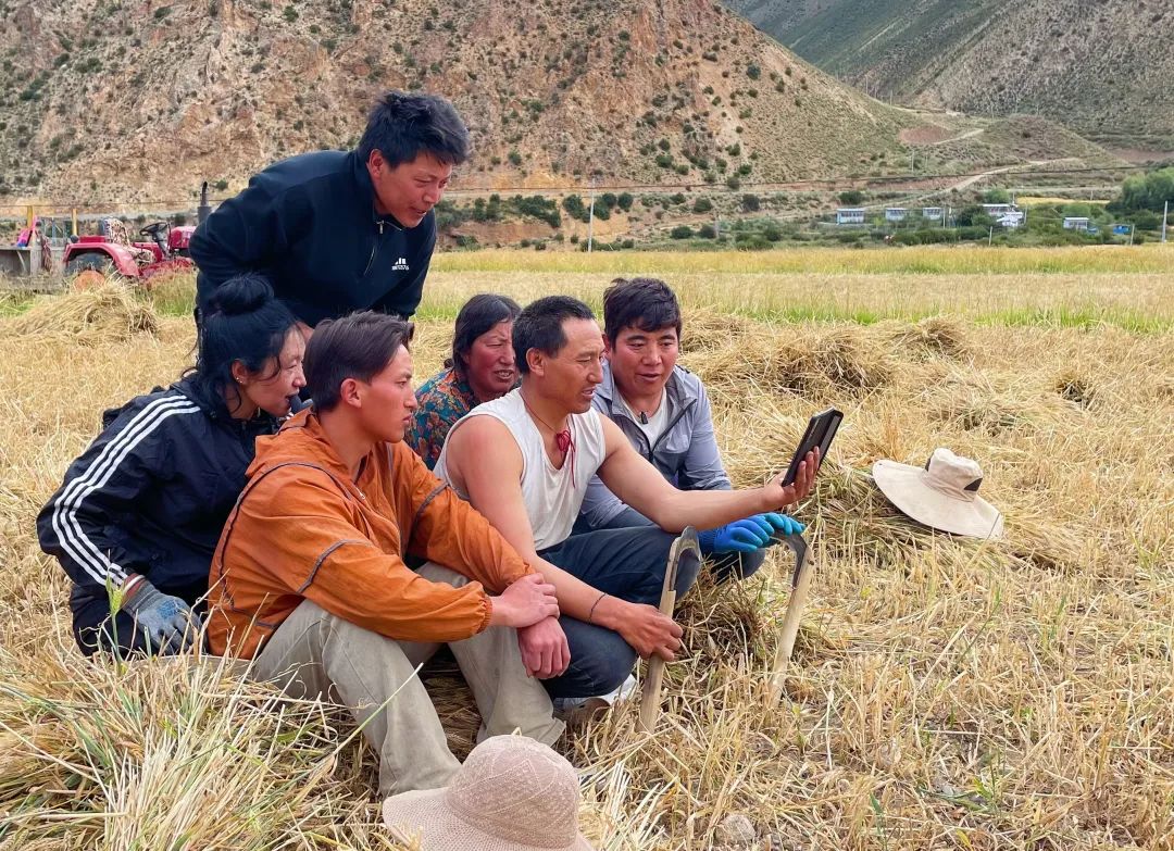 圖為昌都市洛隆縣格亞村群眾在田間地頭收聽收看西藏自治區成立60周年慶祝大會盛況。記者 白瑪澤旺 通訊員 布嘎 攝