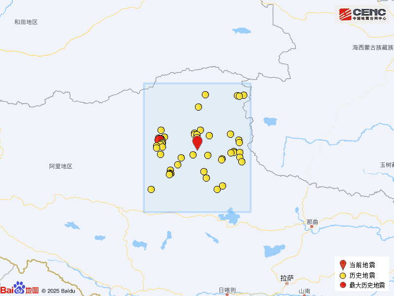 歷史地震:根據中國地震臺網速報目錄,震中周邊200公里內近5年來發生3級以上地震共86次,最大地震是2024年6月1日在西藏那曲市尼瑪縣發生的5.9級地震(距離本次震中131公里),按震級大小前50次歷史地震分布如圖。