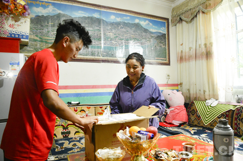 圖為卓嘎與兒子羅布次仁一起鄭重打開中央代表團贈送的全自動酥油茶壺包裝 攝影:趙振宇