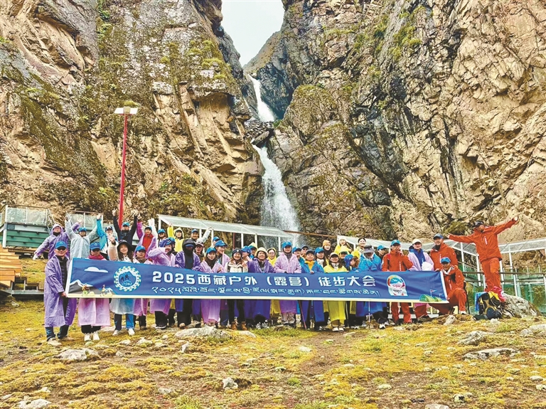 圖為參加西藏戶外(露營)徒步大會的戶外徒步愛好者在曲加瀑布前合影。本報記者 歐珠次仁 攝
