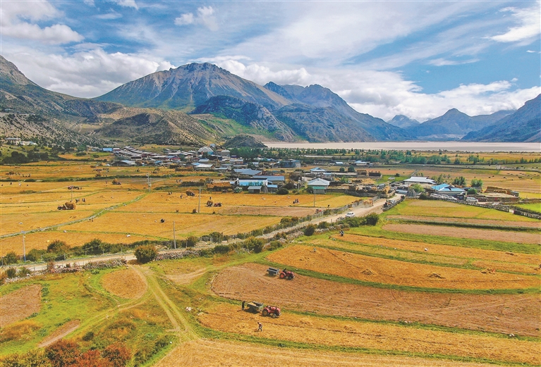 金秋時節(jié),昌都市八宿縣然烏鎮(zhèn)雅卡村的青稞田一片金黃,鋪展至巍峨的雪山腳下,構(gòu)成一幅動人的畫卷。伴隨著機器的轟鳴,青稞收割正式開始,村民駕駛著農(nóng)用車來回運輸,一派熱鬧繁忙的豐收景象。記者 白瑪澤旺 次仁平措 攝影報道