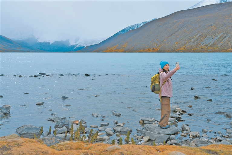 圖為游客在薩普景區自拍留念。記者 萬靖 攝