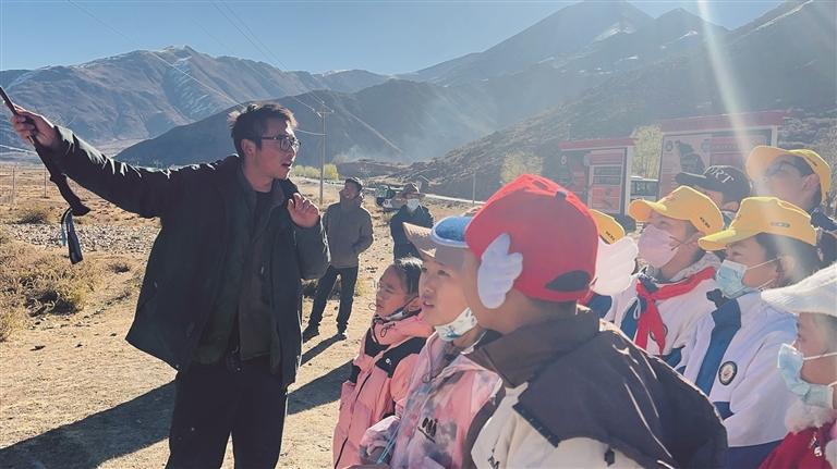 小朋友們在保護中心工作人員李義旺的帶領下了解雪豹生存環境。