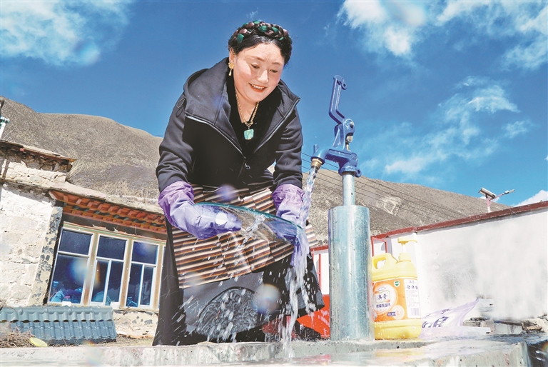 墨竹工卡縣門巴鄉仁多崗村村民曲央在自家院子里用自來水清洗廚具。