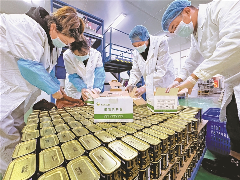 圖為林芝市工布江達縣藏香豬產業園內,員工在對加工好的藏香豬肉罐頭進行分類打包。