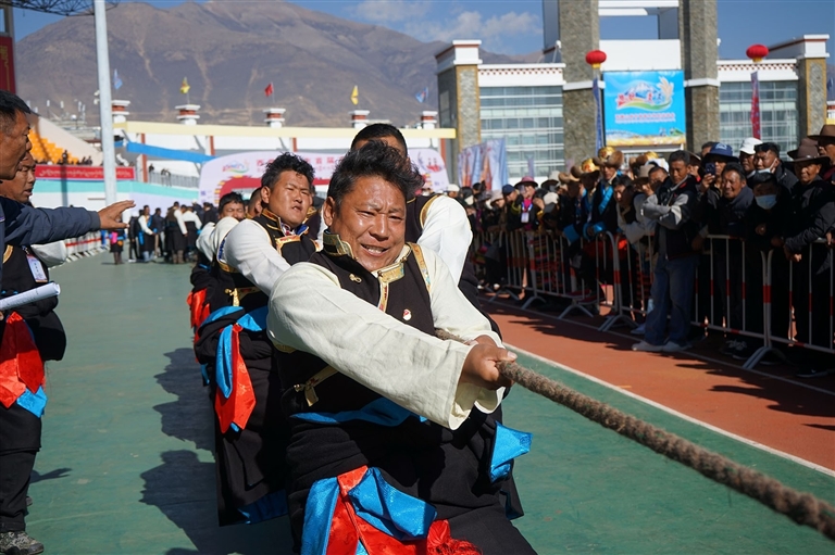 記者置身于賽場,最直觀的感受并非競技的緊張,而是一種蓬勃的生命力在盡情舒展。這里的比賽,吶喊聲帶著鄉音,勝利的歡呼與田間勞作時的號子相互呼應。在極具特色的“押加”比賽(即大象拔河)現場,來自隆子縣的扎西達杰成為全場的焦點。他穿著隆子縣的傳統服飾,面容質樸神情嚴肅,裁判哨聲吹響,與對手反向對拉的瞬間,他全身的肌肉瞬間繃緊,四肢緊緊地“吸附”在地上,那是在千百次揮鎬、背負牧草中錘煉出的力量。僵持、角力,在鄉親的“加油”聲中,他猛然發力,贏得了比賽。