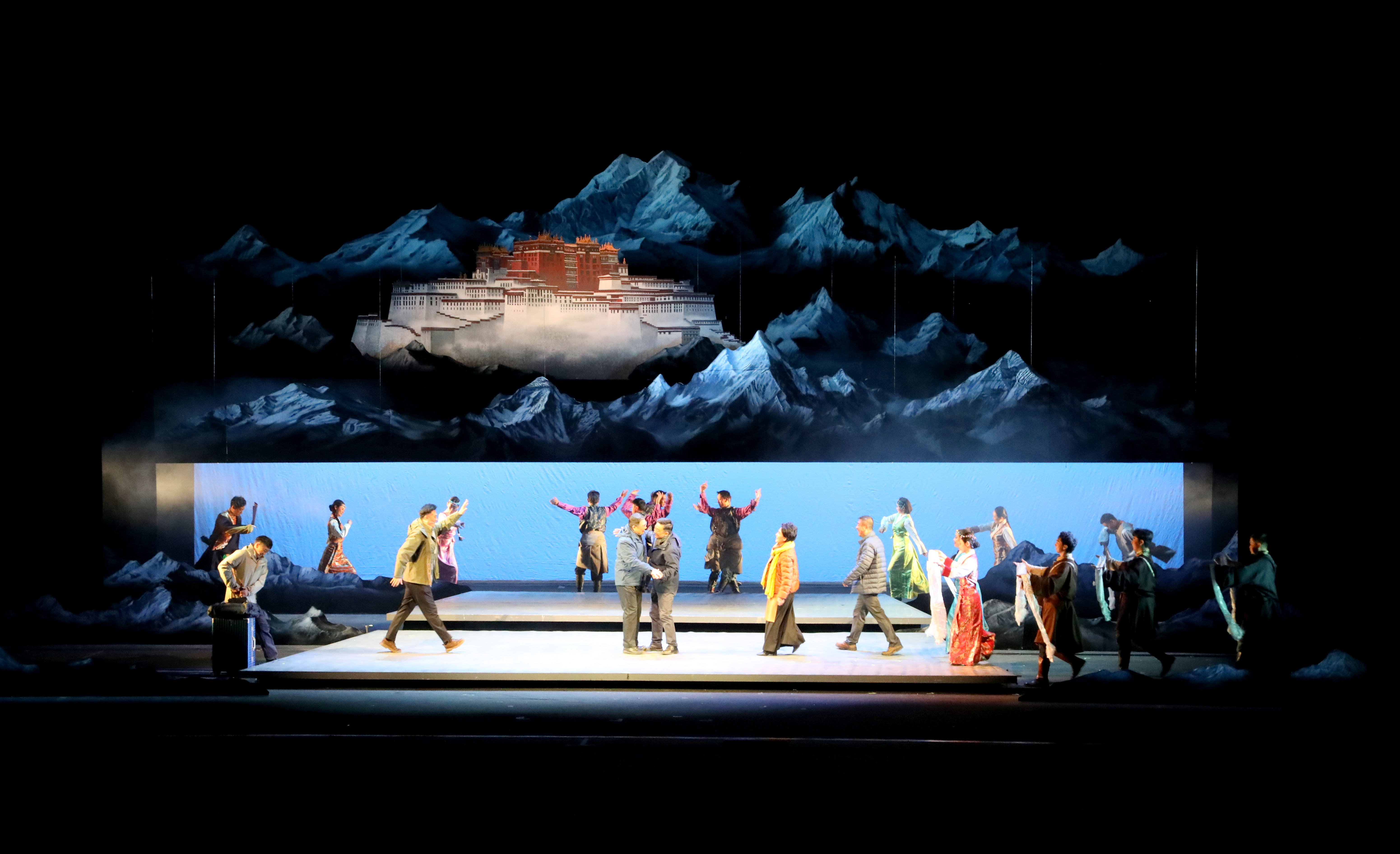 該劇以創新藝術手法實現京藏文化融合創新:舞美設計采用虛實結合模式,通過多媒體技術呈現布達拉宮、雪山等高原盛景,與援藏干部辦公場景、藏族群眾生活場景等無縫銜接;藍色“拉薩河”舞臺意象貫穿全劇,既是高原地理標志,更是兩地情感紐帶;音樂創作中三弦與扎木念琴、嗩吶與加林琴和諧共鳴,結尾主題曲以藏族原生態女聲與北京饒舌融合,構建文化同頻共振美學圖景。北京市曲劇團演員以精湛表演,生動詮釋援藏干部的堅守奉獻與藏族同胞的真誠支持,引發觀眾強烈共鳴。