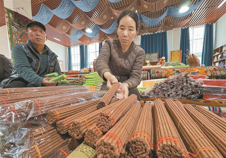 昌都市貢覺縣堤無瑪藝術傳承專業合作社的員工在包裝藏香。