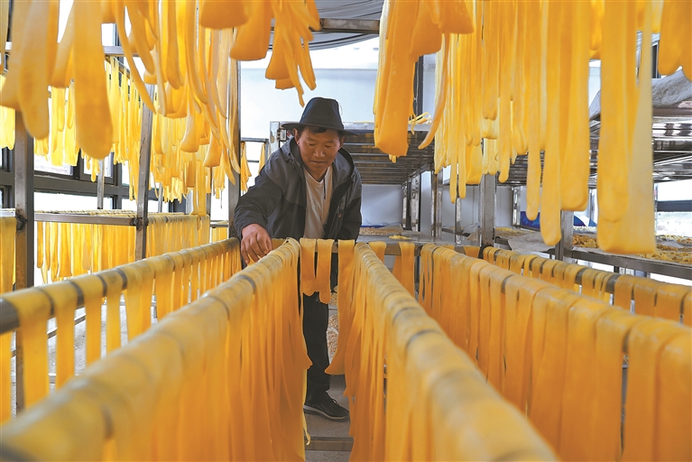 那曲市嘉黎縣麥地卡鄉的牧民在合作社車間晾曬奶制品“拉拉”。記者 白瑪澤旺 次仁平措 攝