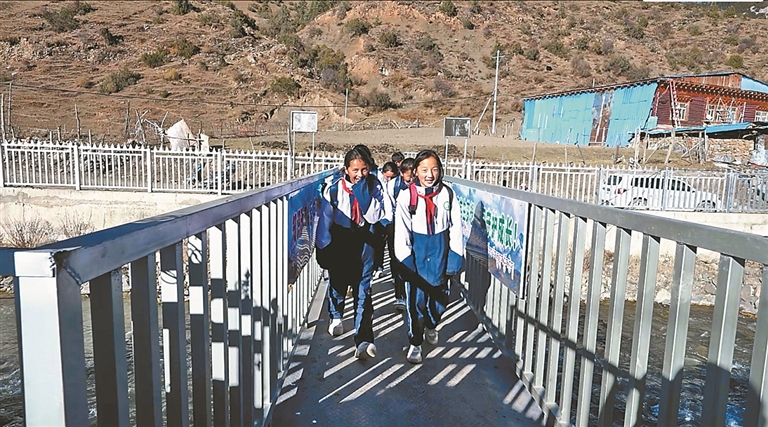 則巴鄉(xiāng)第二小學(xué)的學(xué)生開心地走在駐村工作隊新修建的便橋上。