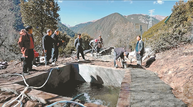 則巴鄉(xiāng)達(dá)曲村干部與群眾一起清理水池。記者 平措郎加 攝
