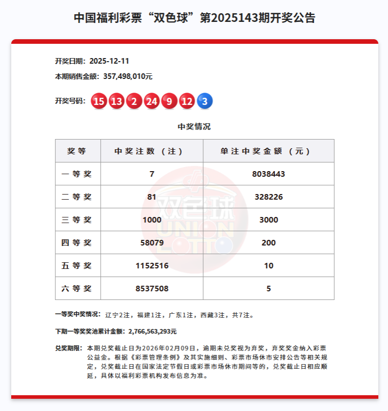 12月11日,福彩雙色球第2025143期開獎,我區拉薩市墨竹工卡縣54010158號銷售網點喜中3注一等獎,單注獎金803.84萬元,總獎金高達2411.52萬元,這也是我區福利彩票今年中出的最高金額大獎。