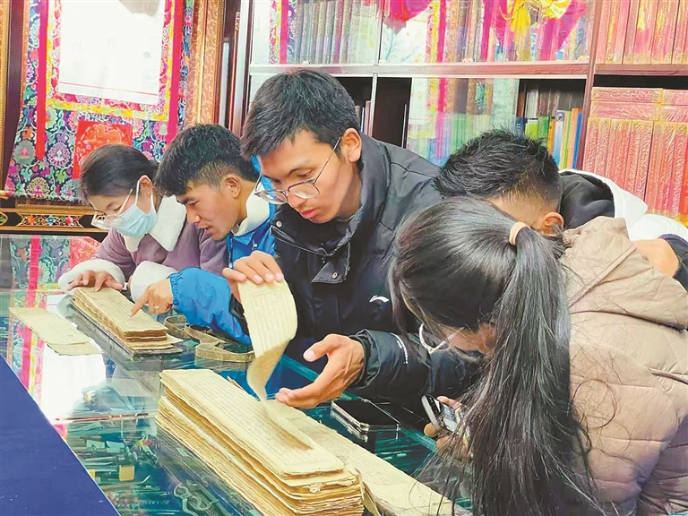 學生在藏醫展館翻閱藏醫藥技藝配方。