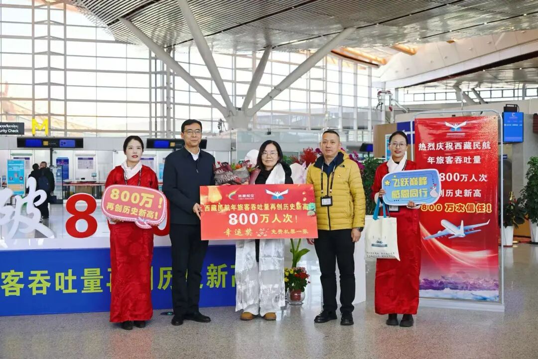 12月29日,拉薩貢嘎國際機場抽取了第800萬名幸運旅客,工作人員與旅客合影。