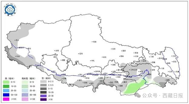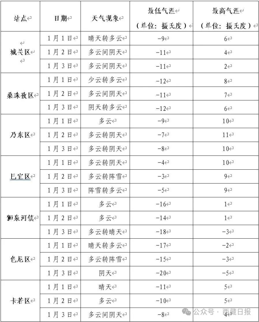 降水預報:預計1月1日,林芝、山南南部和阿里南部有小雪(雨),部分地方中雪;日喀則南部、拉薩、那曲東部、昌都北部和阿里西部多云,部分地方陰天有陣雪;其他地方少云間多云。1月2日至3日,林芝、那曲東部和山南南部有小到中雪(雨),部分高海拔地方有大雪;阿里南部、日喀則南部、昌都北部、拉薩東部和北部陰天有陣雪,部分高海拔地方有小到中雪;其他地方多云。