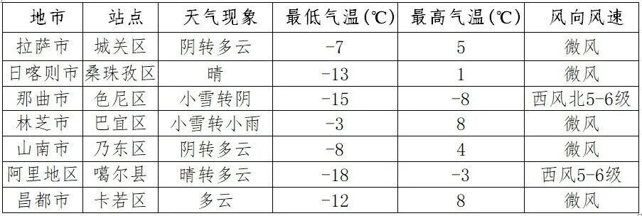 48小時趨勢預報:林芝、山南、日喀則南部和阿里南部陰天有小雪(雨),部分高海拔地方有中雪;其他地方少云間多云。阿里、那曲、日喀則西部和南部有6級左右大風。