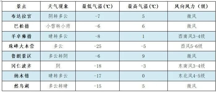 72小時趨勢預報:林芝和山南南部多云間陰天,部分地方有陣雪(雨);其他地方少云間多云。阿里、那曲、日喀則西部和南部有7級左右大風。