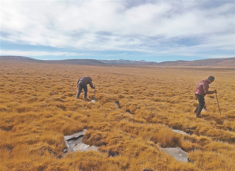圖為聶榮縣查當鄉瑪布村生態管護員正在敲碎草原上的冰層。 遲巴加 提供