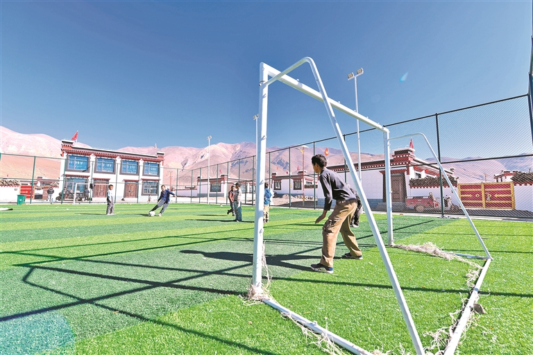 圖為定日縣長(zhǎng)所鄉(xiāng)森嘎村新修建的足球場(chǎng)上,孩子們?cè)谔咦闱颉S浾?旦增嘎瓦 楊子彥 扎西頓珠 攝