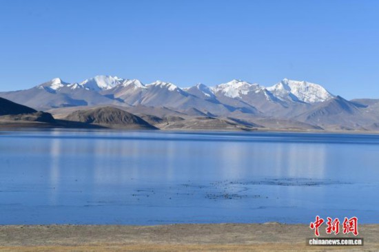 1月18日,沉錯水域湖岸的雪山風光。中新社記者 貢嘎來松 攝