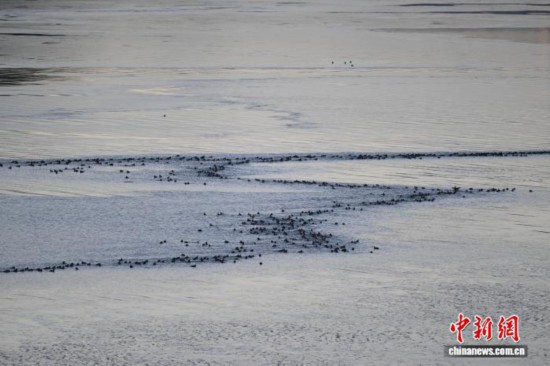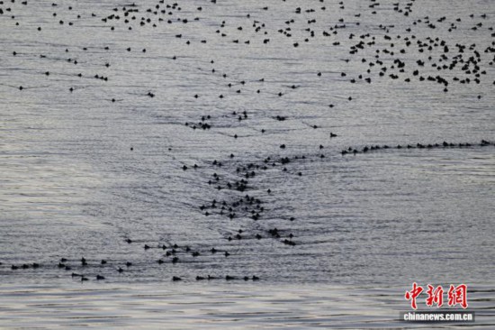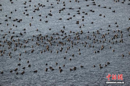 1月18日,成群的赤嘴潛鴨在沉錯水域越冬。中新社記者 貢嘎來松 攝