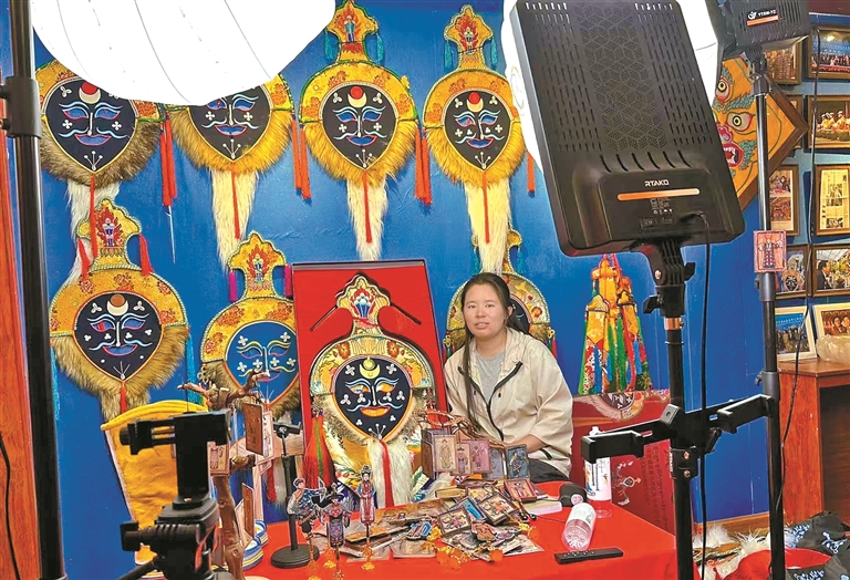 達孜區雪鄉阿古傳統藏戲服飾農牧民專業合作社員工通過網絡直播,拓寬藏戲服飾銷售渠道。