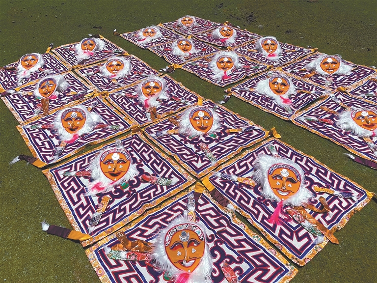 作為藏戲藝術的重要載體,色彩繽紛的藏戲服飾、神秘獨特的面具常讓人眼前一亮,但其制作技藝用料考究、形制莊重,極其考驗匠人的功底。拉薩市達孜區雪鄉扎西崗村的阿古家族,是當地有名的藏戲服飾制作世家,憑借精湛手藝傳承五代,有著數百年的歷史。