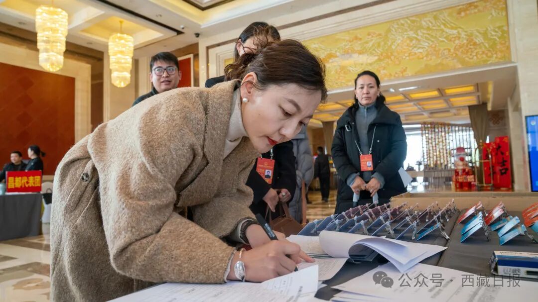 “這是您的會(huì)議資料,請(qǐng)拿好。”拉薩飯店報(bào)到處,在工作人員引導(dǎo)下,代表們依次簽到。