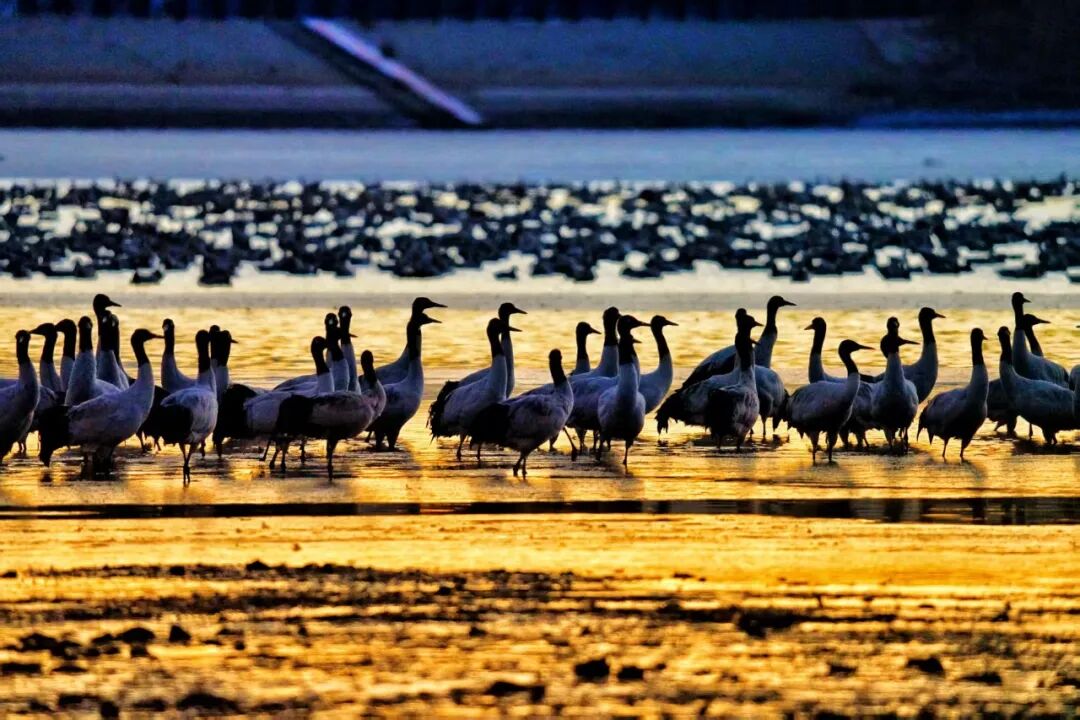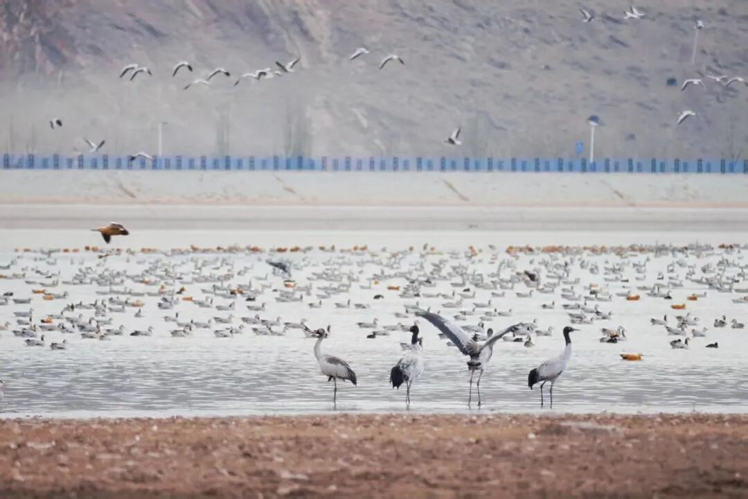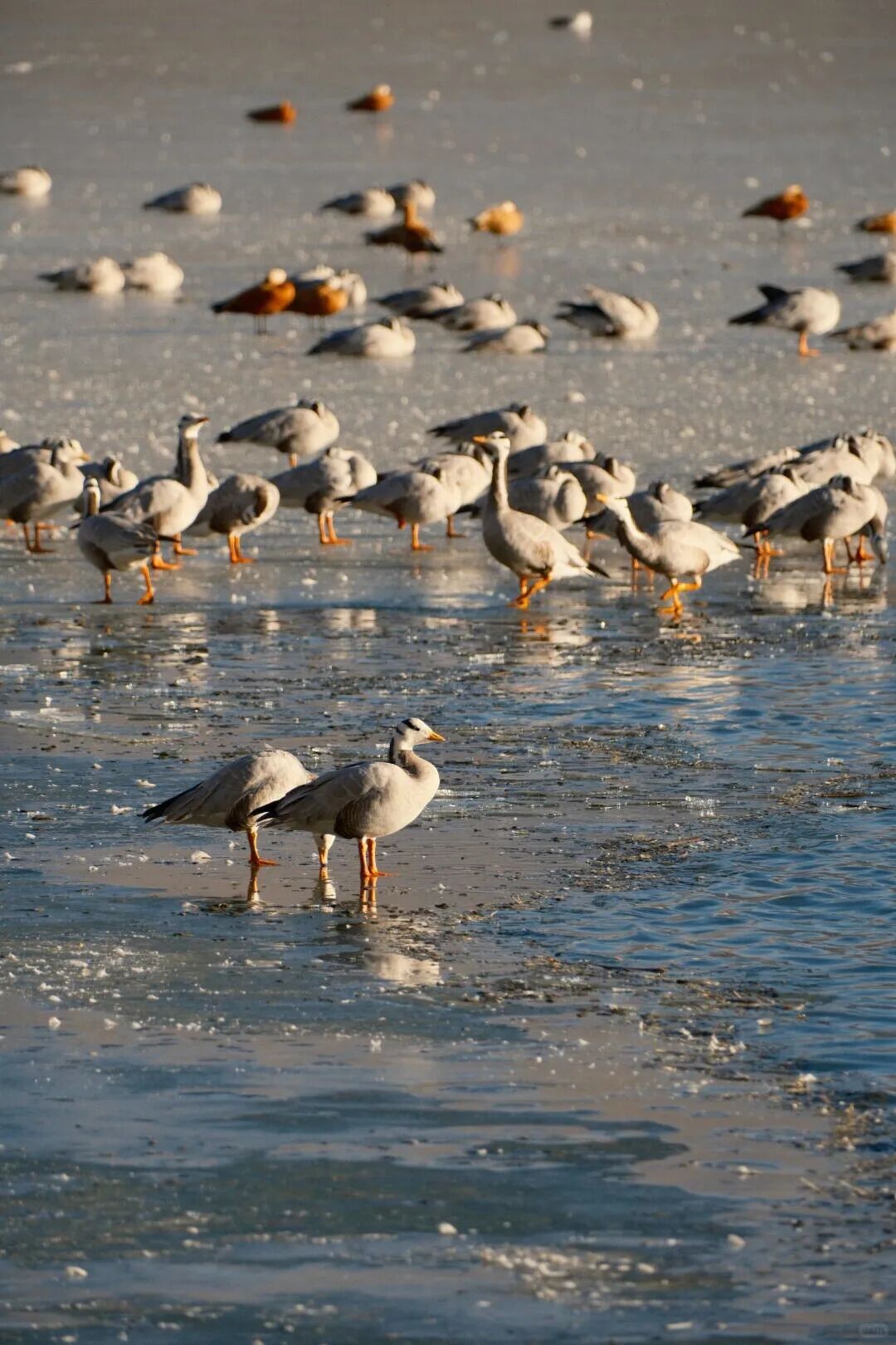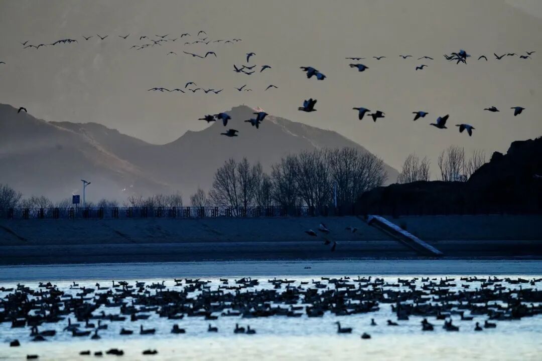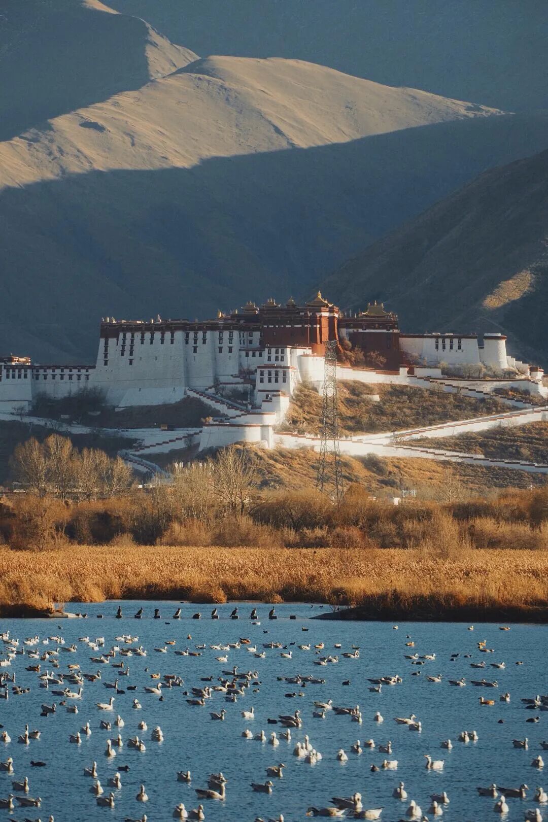 布達拉宮巍然聳立與結冰的水面構成一幅靜謐的冬日畫卷。這里是候鳥越冬的天堂,黑頸鶴、斑頭雁等候鳥在此棲息,為濕地增添了無限生機。