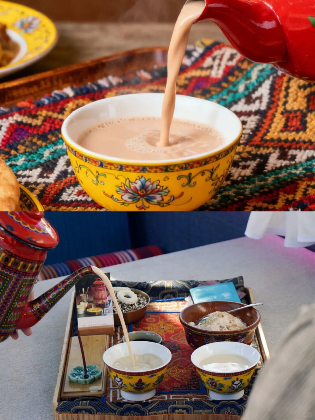 藏式甜茶醇厚絲滑、糌粑捏成了小團子,地道的藏式下午茶,讓你邊品美食邊賞風景,別有一番風味。