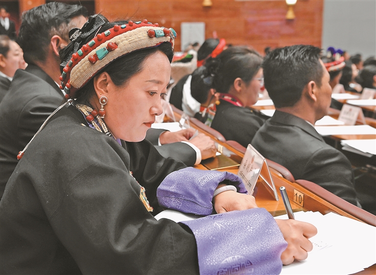 人大代表們在認(rèn)真聽會(huì)。記者 洛桑 攝