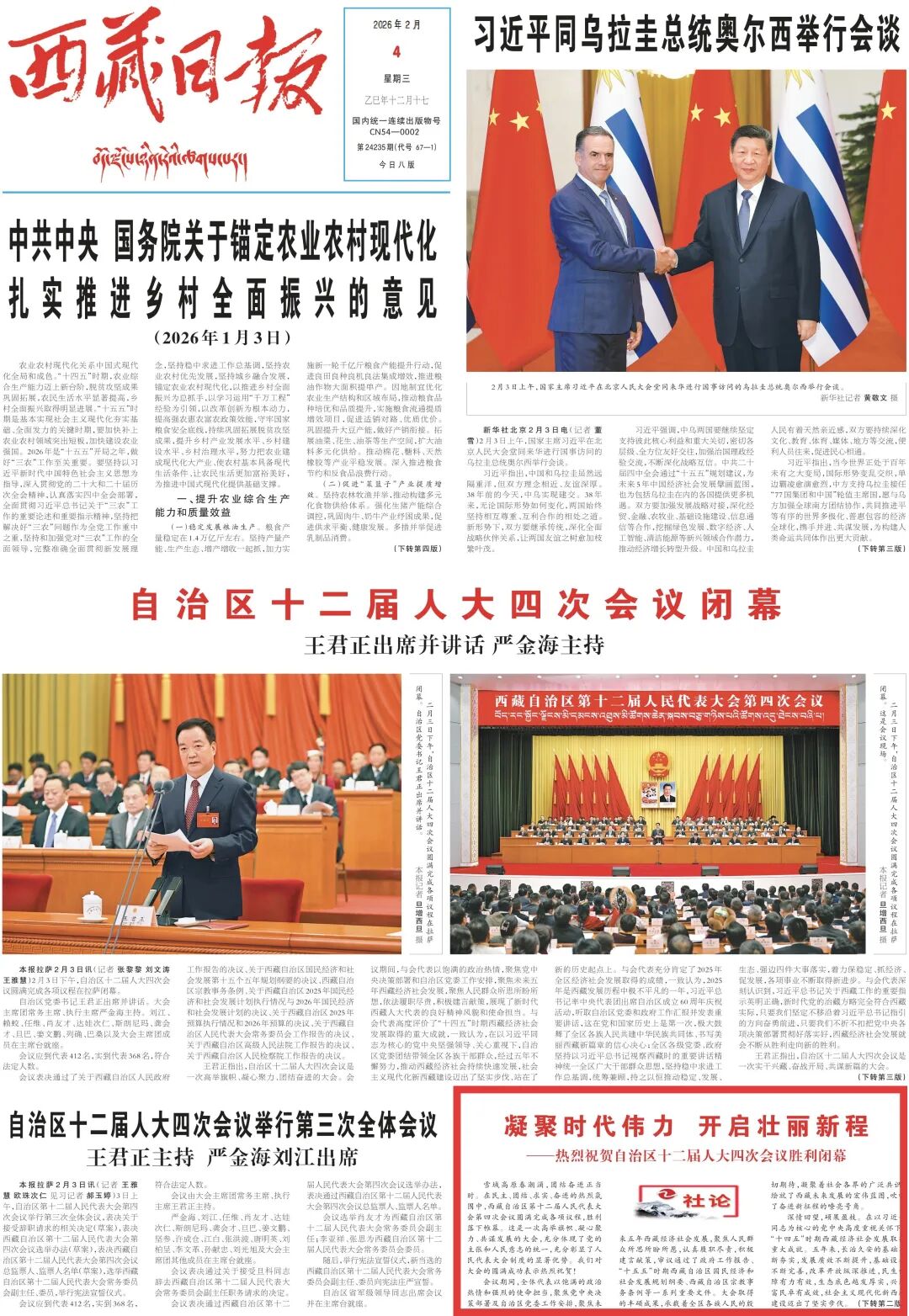 西藏自治區第十二屆人民代表大會第四次會議、政協第十二屆西藏自治區委員會第四次會議圓滿完成各項議程,分別于2月3日、2月2日在拉薩勝利閉幕。