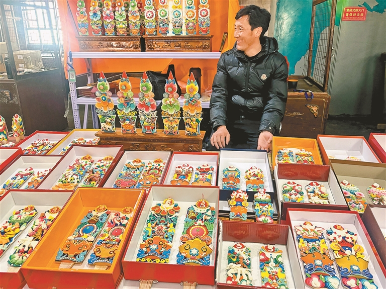 在拉薩八廓商城,“仁布亞德酥油花”的品牌標識格外醒目。師傅們精心制作的酥油花,經規范包裝后運抵商城銷售。新春前夕,商城內70多個酥油花攤位,經營者大多來自日喀則市仁布縣,每年都會專程前來趕制售賣。臨近正午,一排排酥油花整齊陳列,蓮花、祥云、鯉魚等傳統造型栩栩如生、做工精致,吸引不少市民游客駐足選購。