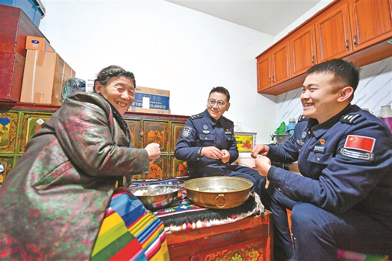“本來想著今年回不了家,心里空落落的,沒想到在石曲哥家過上了這么熱鬧的‘古突’夜,也算是吃上了年夜飯。”去年剛參加工作的年輕民警徐若吃到一塊象征“吉祥”的面疙瘩,眼眶微熱。次仁卓瑪又為他添上一勺湯:“我們是一家人,這里就是家。”