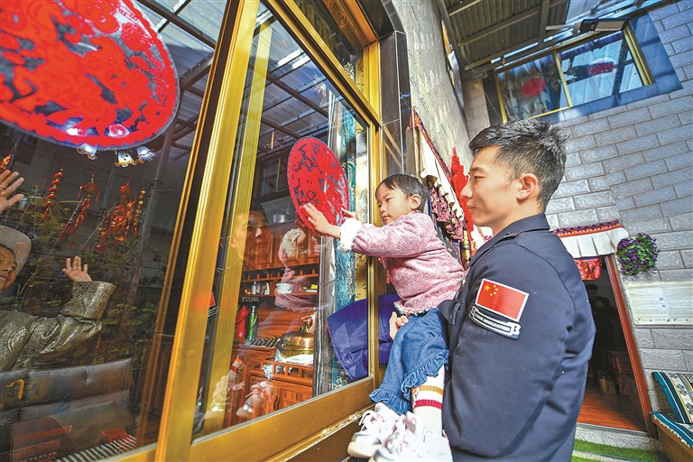 民警抱著普布倉決的小孫女貼窗花。