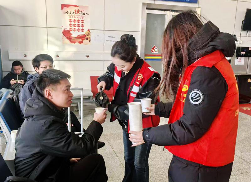 圖為共青團阿里地區委員會組織西部計劃志愿者,聯合阿里昆莎機場共同開展春運“暖冬行動”志愿服務。圖為志愿者在為旅客倒熱水。記者 達珍 通訊員 邊珍 攝