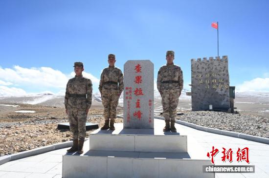 查果拉哨所,戰士們與主峰標志性石碑合影。