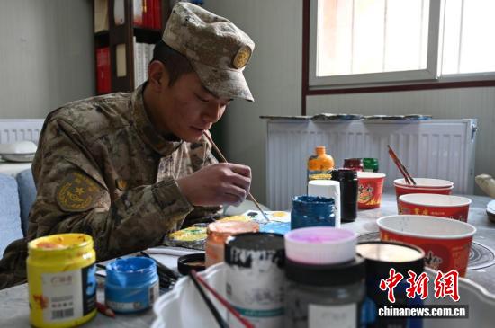 在5592哨所,戰士在畫石頭畫。