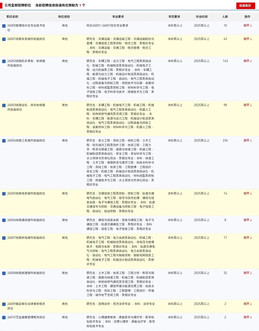 2.崗位代碼26001-26008:要求在校期間所學專業方向為鐵路專業方向或所學主要課程中包含鐵路專業課程,相近專業高質量院校畢業生優先;